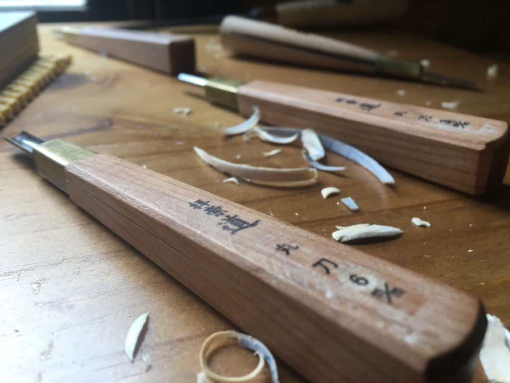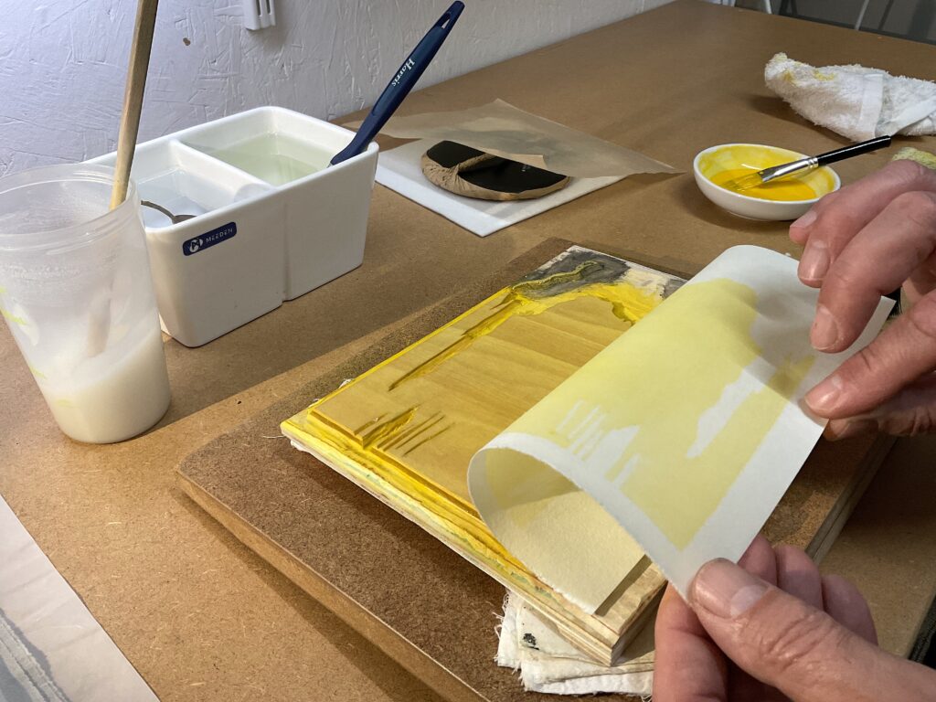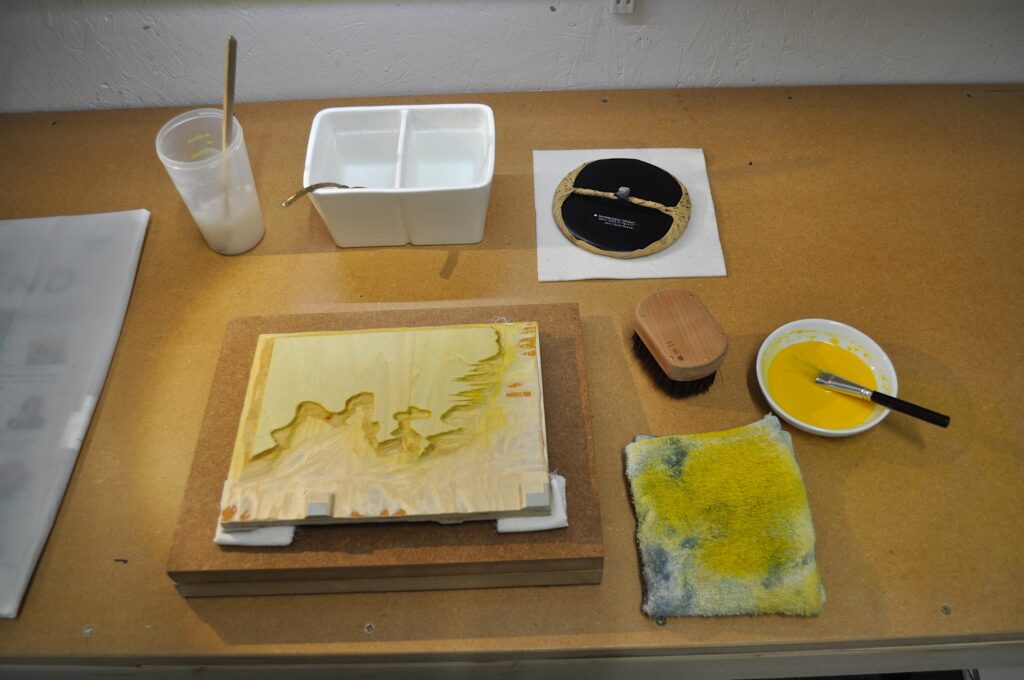 Mokuhanga is the traditional Japanese technique of water-based woodblock printing. It is known for its luminous colours, hand-printed textures, and its deep connection to natural materials, including wood, water, pigment, and paper. Unlike Western woodblock printing, which often uses oil-based inks and a press, Mokuhanga is printed entirely by hand using water based pigments such as watercolour paint and sumi-e (black ink), mixed with nori paste (a traditional adhesive made from boiled rice flour). The process of hand printing uses a hand-held baren to burnish the back of the damp paper. This allows for subtle layers, soft blends (bokashi), and a distinct tactile quality. The mixture of pigment, water, and nori creates the characteristic transparency and softness of Mokuhanga.