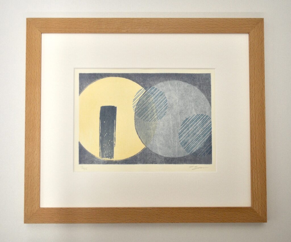An original handmade print, created in my studio in Winchester. Mercurial Fountain examines the alchemical union of opposite, the joining of sun and moon, ego and unconscious. The fountain is marked by a spontaneous brushstroke that cuts through the sun. The descending motion of the fountain is developed through a carefully controlled bokashi gradation, allowing the form to carry the visual weight of flowing water as it moves downward. Opposite the sun, the moon appears as a more subtle presence: its surface reveals the natural gradient of the woodgrain, referred to in Mokuhanga as Mokume-zuri, a specific printing technique that intentionally reveal or emphasize the natural woodgrain of the block.